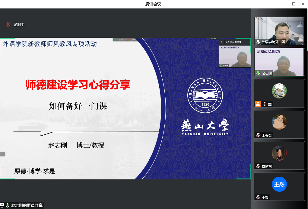 最后,郑占国副院长从当下的国际环境、疫情形势出发,对新进教师做了以下提示:首先是如何理解教师这一职业。郑院长引用韩愈“师者,传道授业解惑者也”这一名言,强调了传“道”乃教师从业之首位,向学生传播中国优秀的文化、正确的价值观是重中之重。在这之上,不断地锤炼自己授业的能力、方法,提升站位高度、先解己惑再解他惑,方能做好一名高校教师。其次,要深入理解外语教学的实质。第三,要平衡好教学与科研之间的关系。首重教学,以研促教。第四,要批判地看待网络上的各种资源,有选择性地将其运用到自己的教学当中。最后,重视团队精神。独木不成林,要积极主动地和其他老师学习、交流,提高综合能力。