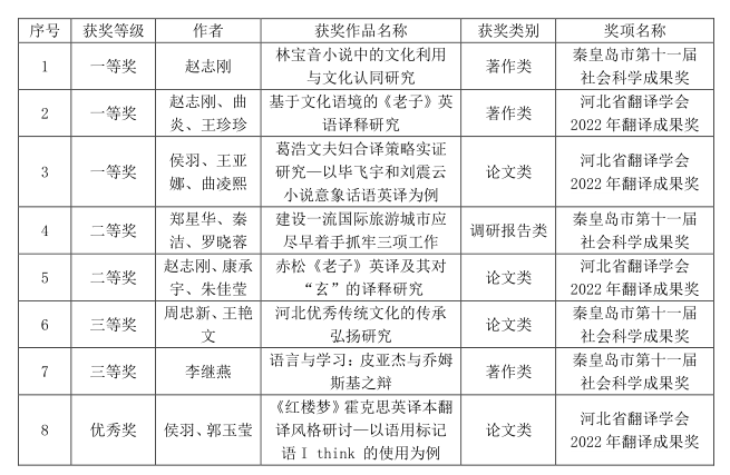日前,秦皇岛市第十一届社会科学成果奖获奖和河北省翻译学会2022年翻译成果获奖名单公布,米兰MILAN(中国)在两项评奖活动中共斩获8个奖项,其中一等奖3项,二等奖2项,三等奖2项,优秀奖1项。