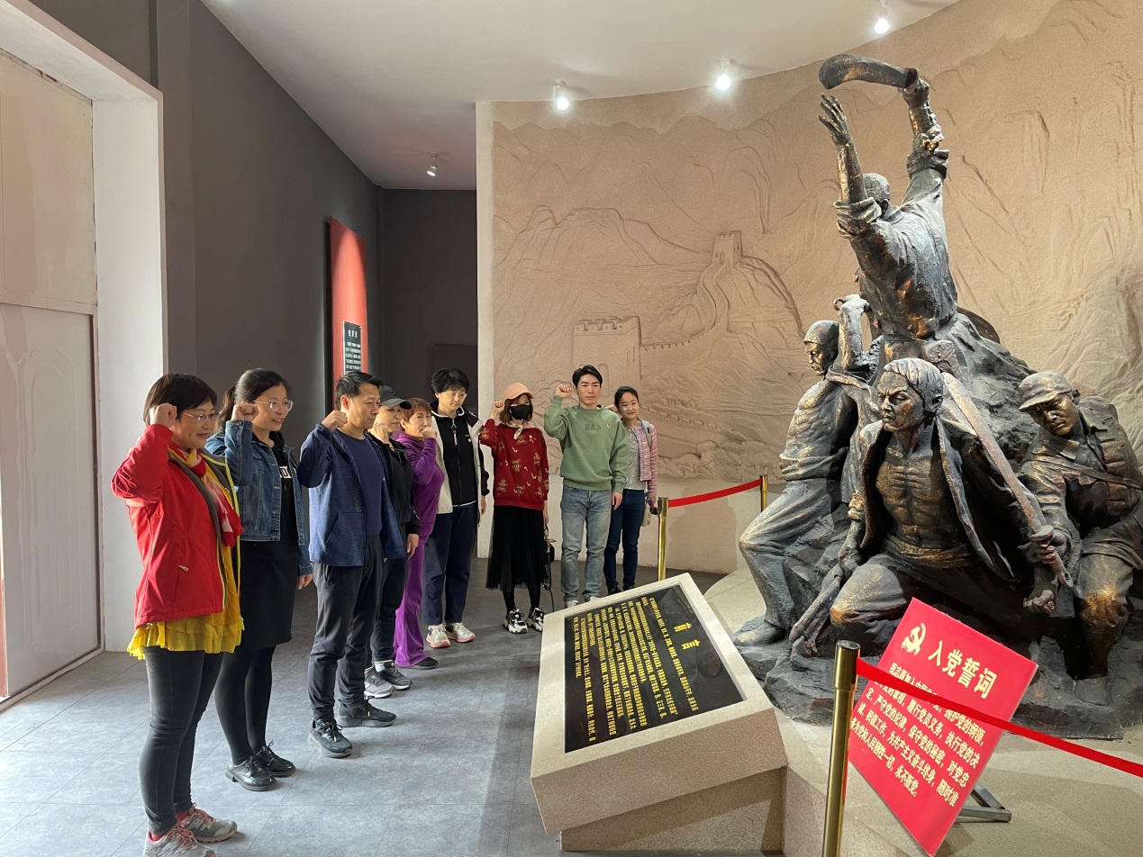 参加活动的党员教师在现场重温入党誓词,大家面对鲜红的党旗庄严宣誓,再次体会了加入中国共产党时的欣喜和荣耀。随后,在纪念馆讲解员的引导下,参加活动的党员教师参观了抗战期间珍贵的历史图片、实物、微缩仿真模型等,重温了在中国共产党领导下全国各族人民共同抵抗日本帝国主义侵略的历史,接受了一次精神上的洗礼。