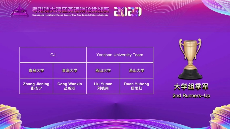 4月5日,2023年外研社粤港澳大湾区英语辩论挑战赛(GBA)落下帷幕。燕山大学外语学院派出英语系20级学生段雨虹同学,19级学生刘毓南同学参赛,由张宇老师担任指导教师,经过五轮的高强度激烈角逐,燕山大学在本次比赛中首次荣获季军成绩;段雨虹同学荣获最佳辩手称号。