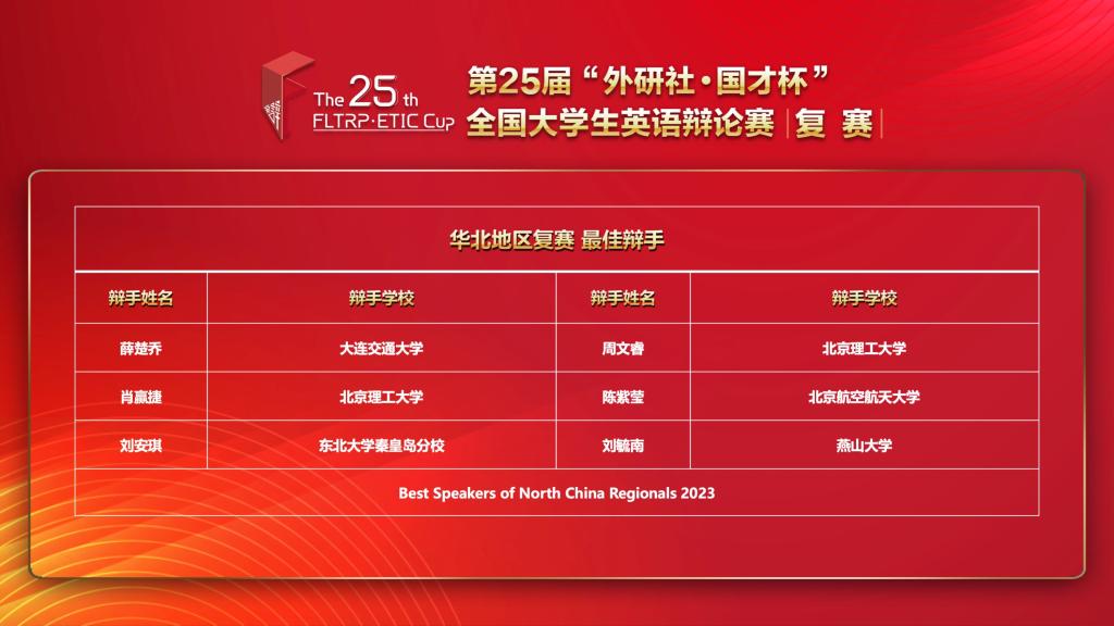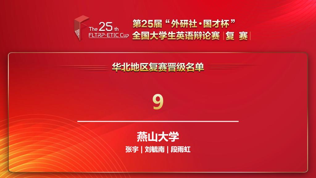 2023年4月7-8日,第二十五届“外研社·国才杯”全国大学生英语辩论赛华北赛区复赛于线上举行。该比赛由校选赛、大区赛和全国决赛三个环节组成。我校所在的华北赛区包括了北京、天津、河北、黑龙江、吉林、辽宁等地88所高校,是综合实力最强、竞争最激烈的赛区。我校英语辩论队经过两天共计五轮的循环赛角逐,最终以第9名的佳绩,顺利晋级全国总决赛,获得华北赛区一等奖。本次参赛的两名队员是来自外语学院英语系2019级学生刘毓南、2020级学生段雨虹,指导教师为英语系张宇老师。