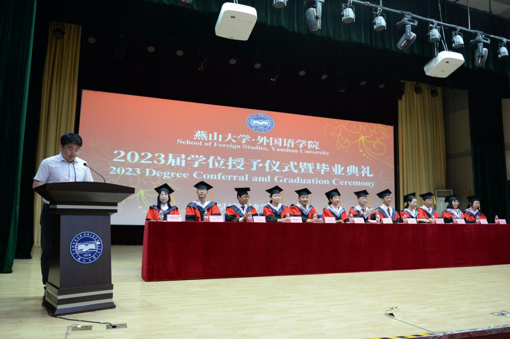上午9时,在雄壮嘹亮的国歌声中,毕业典礼拉开序幕,全场师生庄严肃立,高唱中华人民共和国国歌。首先,院长王林海宣读硕士、本科生毕业文件和学位授予文件,并向顺利完成学业的330名2023届毕业生表示热烈祝贺,向老师们表示衷心感谢,希望同学们乘风破浪、勇往直前,带着燕大赋予的精神和品格,带着学院传授的智慧与能力,在广阔天地中大有可为、大有作为!