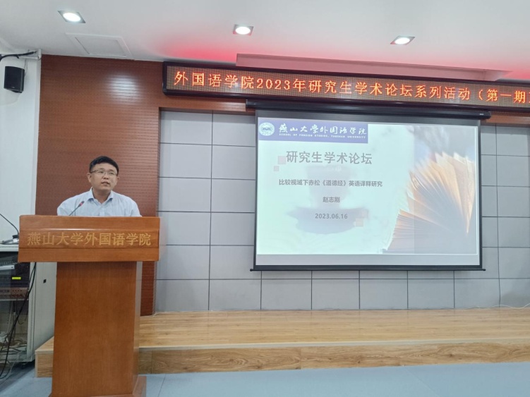 硕导代表赵志刚教授开启了“导师分享”的第一讲。他作了题为《比较视域下赤松<道德经>英语译释研究》的主题分享。他强调翻译古籍的时候要看历代注释,虽有争议性,但也是一个很好的研究视角。要研究不同的古籍译本,就要明确他们的译本特点。赵志刚老师指出,译本中副文本的丰富程度和取材的广泛程度让文本翻译更加保质保量。