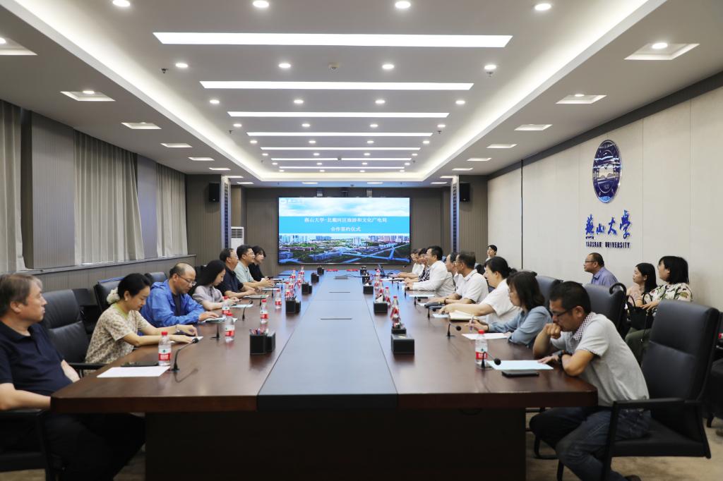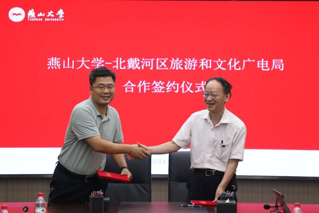 6月28日下午,燕山大学-北戴河文旅局战略合作签约仪式在燕山大学隆重举行,签署了双方全方位合作协议并为双方建立的实训基地和研究中心揭牌。北戴河区旅游与文化广电局党组书记、局长李卫杰、北戴河旅游和文化广电局副局长周娇娇、北戴河文物交流中心主任闫宗学,燕山大学副校长蔡星周、米兰网页版领导班子全体出席了签约仪式,仪式由米兰MILAN(中国)副院长郑占国主持。