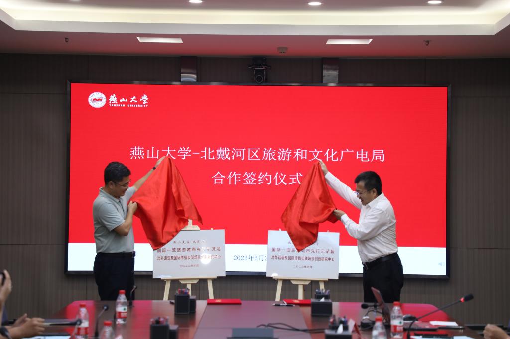 伴随着激昂的音乐,北戴河区文旅局局长李卫杰、米兰网页版院长王林海签署双方合作协议书。随后,北戴河区文旅局局长李卫杰、燕山大学副校长蔡星周为双方“燕山大学-北戴河国际一流旅游城市先行示范区对外话语及国际传播实践场景创新实训基地”和“北戴河-燕山大学 国际一流旅游城市先行示范区对外话语及国际传播实践场景创新研究中心”揭牌。