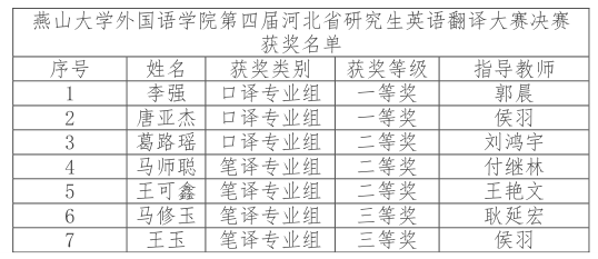 2023年10月21日“河北省第四届高校硕士研究生英语翻译大赛”决赛在华北理工大学举行。7名研究生通过校初赛、省复赛两个阶段的选拔成功晋级决赛,同来自全省近30所高校的107名选手激烈角逐,获得优异成绩,包括一等奖2个,二等奖3个,三等奖2个。