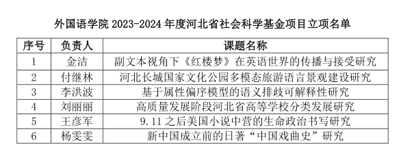 近日,河北省哲学社会科学工作办公室公布了2023-2024年度河北省社科基金项目立项名单。我院6位老师申报的项目获批立项。