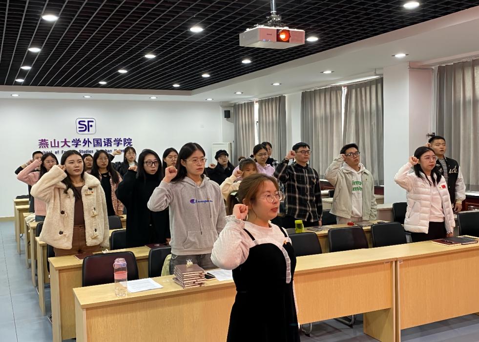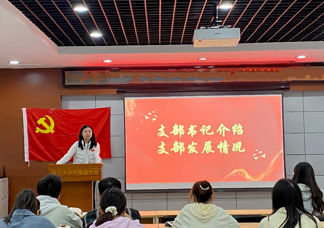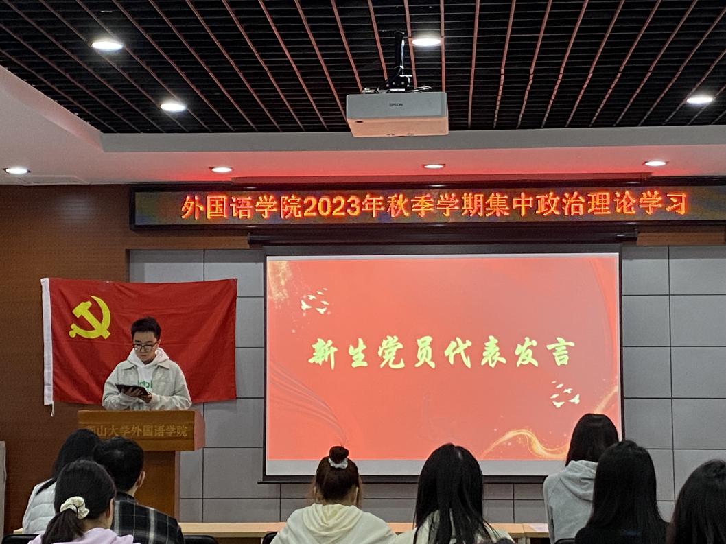 会议第三项,胡嘉豪同志作为新生党员代表发言,他表示,外语学子小到传播文明可为师,大到交流中西能作译,作为青年党员要充分发挥自己专业所能,用行动为下一个百年助力。