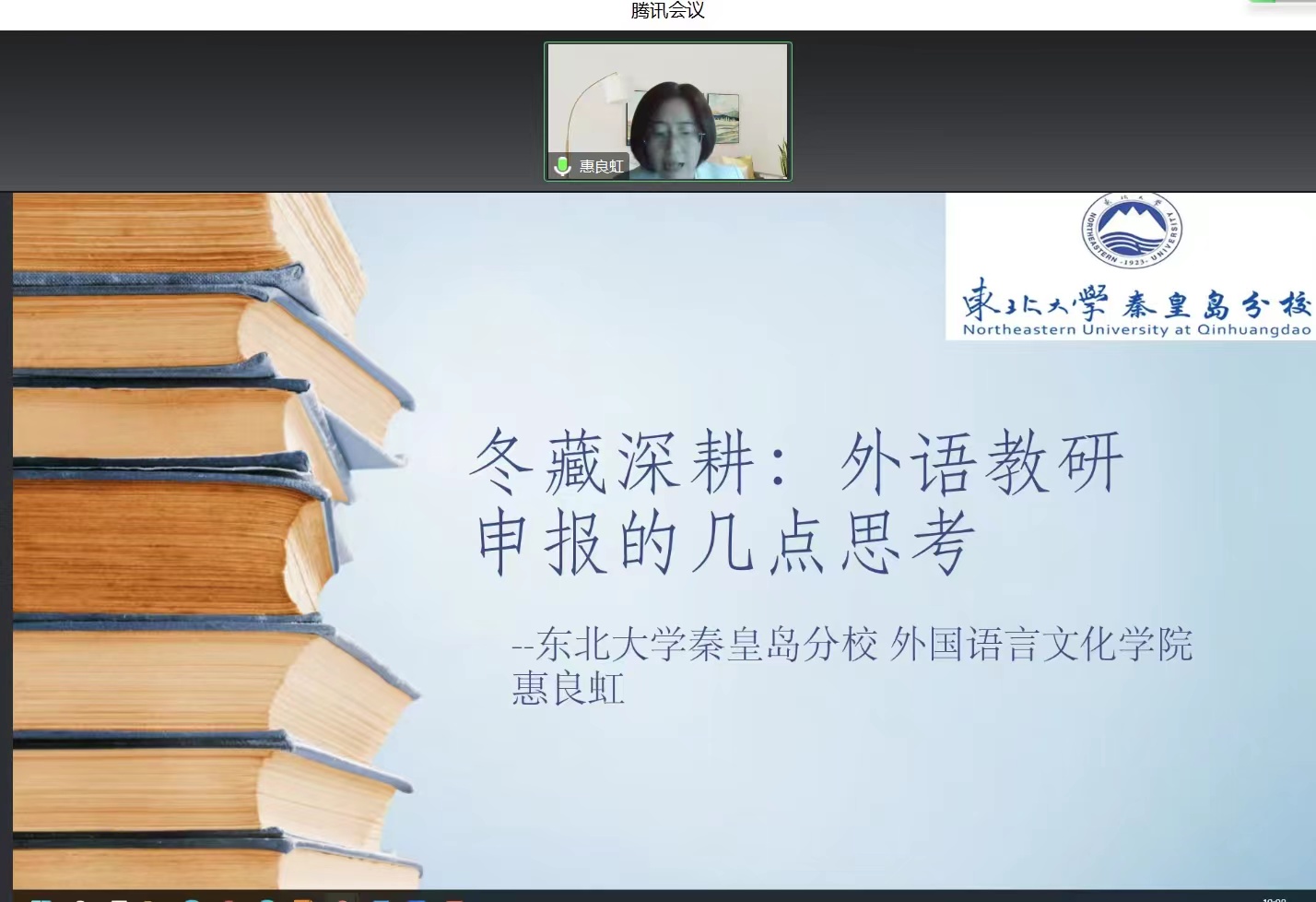 东北大学秦皇岛分校外国语言文化学院惠良虹副教授做了题为《冬藏深耕:外语教研项目申请的几点思考》主旨报告,通过分享自己的科研经历并围绕科研项目申报技巧、论文撰写和投稿技巧、科研人锲而不舍的精神展开论述,鼓励广大教师积极参与科研,以期春华秋实、冬藏夏收。