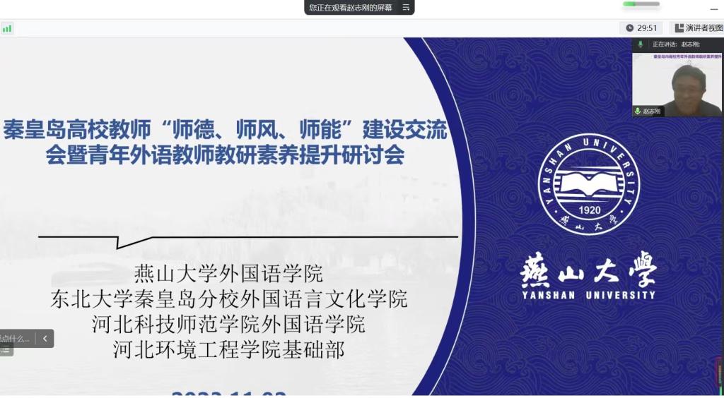 为了认真学习贯彻习近平总书记米兰网页版教育的重要论述,落实立德树人根本任务,牢牢把握教师队伍建设这一关键问题,2023年11月2日19点,米兰网页版与东北大学秦皇岛分校、河北科技师范学院、河北环境工程学院联合举办了“秦皇岛市高校外语教师‘师德、师风、师能’建设交流会暨青年教师教研素养提升研讨会”。
