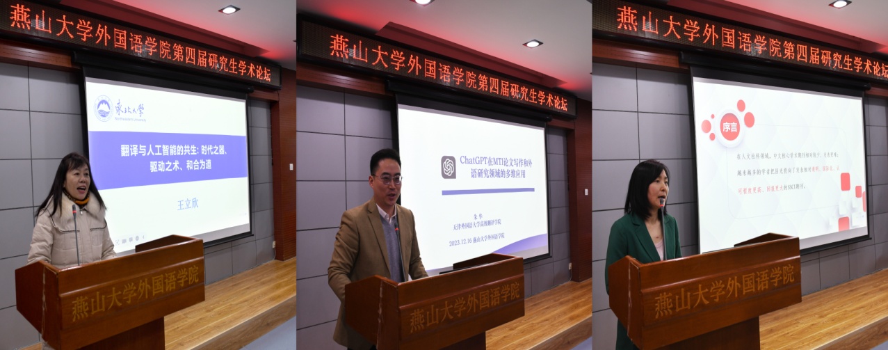 论坛邀请了来自东北大学秦皇岛分校的王立欣教授、天津外国语大学朱华博士、米兰网页版刘艳红博士分别作了题为《翻译与人工智能的共生:时代之器、驱动之术、和合为道》、《ChatGPT在MTI论文写作和外语研究领域的多维应用》和《SSCI期刊论文发表与写作点津》的主旨报告。三位报告人从各自研究领域深入浅出的讲解了现如今最前沿的学术问题。他们深厚的学术积淀和诙谐幽默的语言风格,得到了与会师生们的一阵阵掌声。