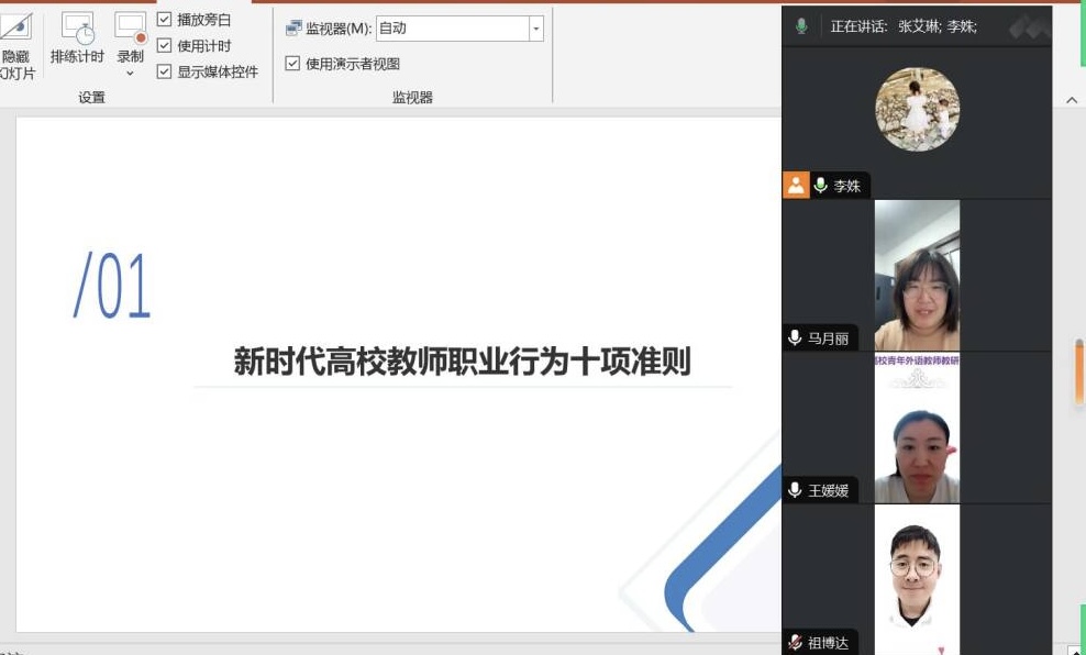 2024年4月16日,西语系法语专业开展学习《新时代高校教师职业行为十项准则》主题教育线上分享会,会议由李姝老师主持,法语专业全体教师参加会议。结合主题教育,李姝老师带领学习了《新时代高校教师职业行为十项准则》的内容,结合工作实践进行解读,各位老师共同探讨了自己的理解与感受,认识到进一步规范教师履职履责行为,落实立德树人根本任务的重要性。
