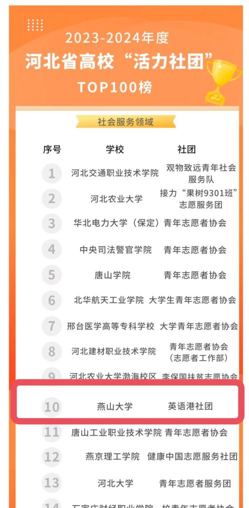 近日,河北省发布了2023-2024学年河北省高校“活力社团”TOP100榜单,燕山大学共五个社团入选,其中,米兰MILAN(中国)英语港在社会服务领域充分发挥社团育人功能,入选“活力社团”TOP100榜单。