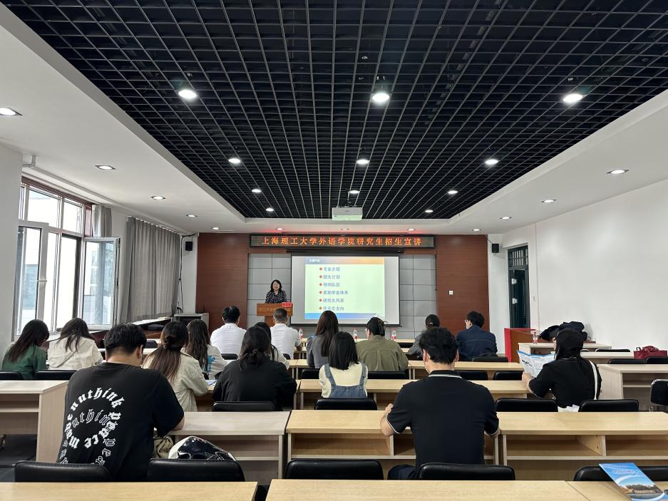 宣讲会上,韩戈玲副院长以其丰富的教育经验和深厚的学术背景,从办学历史、专业设置、课程体系、师资力量、学术研究、国际交流以及学生就业去向等多个方面,全面而细致地介绍了上海理工大学外语学院硕士点的基本情况。她不仅分享了学院在研究生教育上的成功案例,还深入剖析了学生在学术和职业发展上的广阔前景,为我院师生深入全面了解上海理工大学外语学院的硕士点的优势及特点提供了宝贵机会,同学们对未来可能选择的研究生教育方向有了更加清晰的认识。同时,宣讲会也为我院与上海理工大学外语学院之间的进一步交流与合作奠定了坚实的基础。