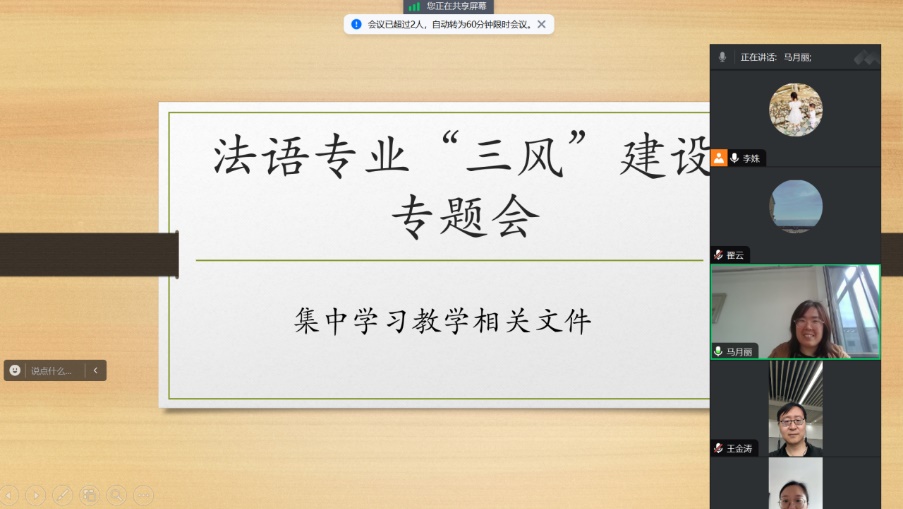 2024年5月23日,西语系法语专业成功举办了“三风建设”线上专题会议。会议由李姝老师主持,法语专业全体教师参会。