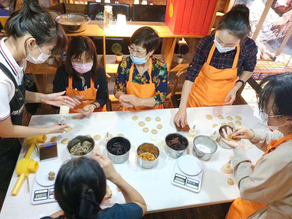 下午1时分,月饼DIY活动准时开始,老师们使出各自的“看家本领”,按照糕点师的指导,有的搓粉,有的将粉皮和馅料按比例搓圆,再把材料放进月饼模里按压成型,制作过程中,老师们都十分积极活跃,互相分工合作,制作着属于自己的中秋月饼,活动现场欢声笑语不绝于耳。