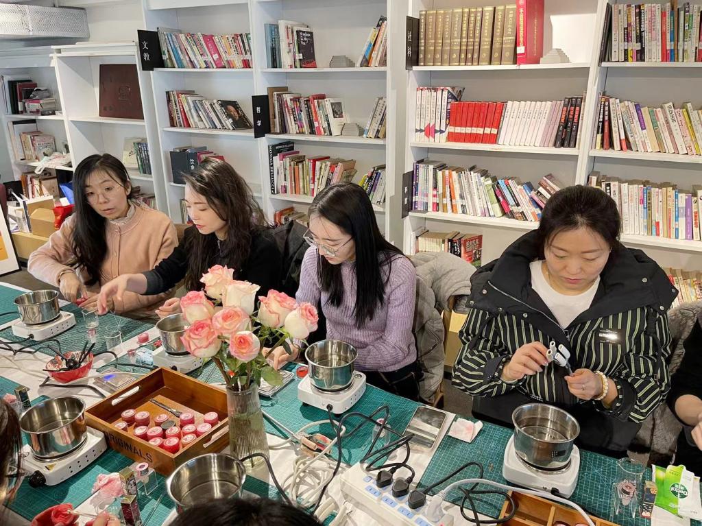 活动邀请专业老师为大家讲解纯天然口红的制作流程,桌子上摆满了各自颜色的色素、蜂蜡、定型模具、搅拌棒、烧杯、小秤……,在专业老师的指导下,从挑选色号、调配比例、加热、入模、冷冻、脱模,在轻松愉悦的氛围中,经过每一道工序,一支支纯天然、零添加的国风口红诞生了,让老师们感受到了满满的成就感和幸福感。