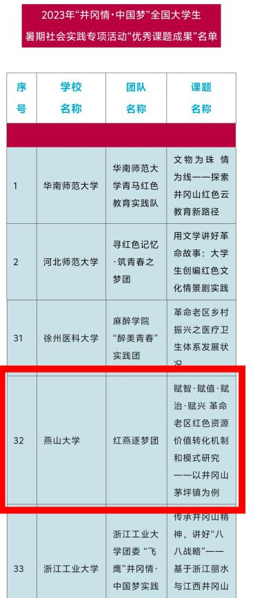 “井冈情•中国梦”暑期社会实践专项活动,旨在深入学习并贯彻习近平新时代中国特色社会主义思想,切实履行党赋予青年的时代使命——“有理想、敢担当、能吃苦、肯奋斗”。本次活动中,我校荣获全国大学生暑期实践专项活动的优秀课题荣誉称号,这不仅是对燕大学子积极投身于新时代社会主义现代化建设伟业的坚定信念的认可,更是对学校社会实践项目在引领力、影响力方面显著提升的肯定。不仅彰显了学子们对于时代责任的积极担当,也进一步彰显了学校在教育实践领域的卓越成就。
