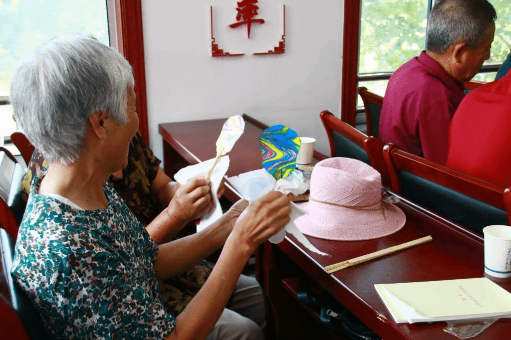 其后,实践团段晨曦、霍一哲向在场党员展示了竹编和漆扇两项非遗技艺背后的故事,通过视频展示了竹编、漆扇不同时期的作品,随着颜料滴入水中,扇面轻轻摇动,大家在水波流动间勾画出各种斑斓的色彩,制作出独一无二的团扇;在“一挑一压”编织技法下,普通的竹条被巧妙地编织成一幅幅栩栩如生的图案,展现了盛世中华的辉煌、长征精神的坚韧以及中国梦的远大。参与其中的党员感慨道:“非遗技艺不仅与红色精神交相辉映,更与优秀传统文化和革命文化实现了完美的融合,这不仅是一次独特的体验,更是对历史的致敬。”
