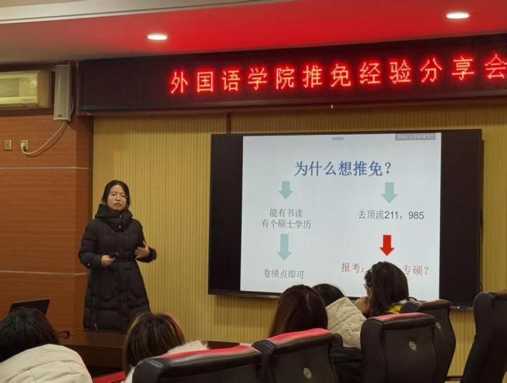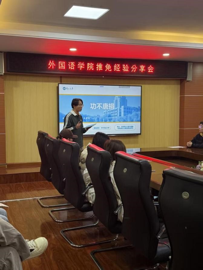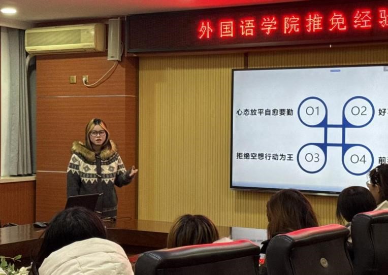 最后,李雪同学围绕“拒绝空想,行动为王”主题展开分享。她建议同学们首先应明确自我定位,了解推免流程与考察重点,在此基础上提前规划、扎实投入专业学习。在具体准备中,她强调要尽早积累推免材料,积极备战笔试、面试,将每一次挑战转化为成长契机。