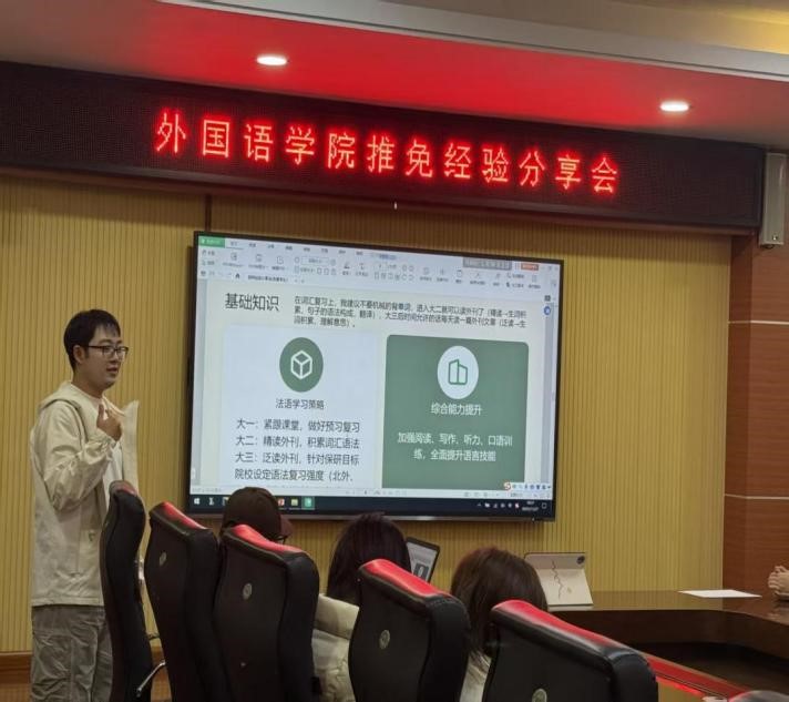接着,张晟同学聚焦小语种学生的独特路径,系统梳理了从夏令营申请到正式推免的全流程。他将这一过程拆解为基础夯实、强化提升与冲刺模拟三大阶段,并强调要注重综合能力提升、善用学习策略、做好复习规划,同时保持积极心态以高效备考。
