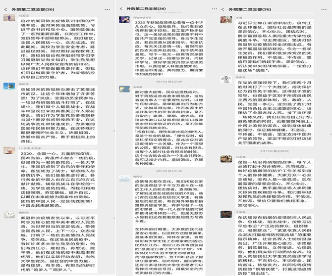 随后支部成员结合疫情防控时事,从党的制度优势、致敬战“疫”英雄、青年责任担当等诸多方面展开了热烈的交流与探讨,纷纷表达了对祖国抗击疫情必胜的决心以及对奋斗在一线的医务工作者与志愿者的敬仰之情,认识到制度优势是一个国家的最大优势。作为青年党员要始终保政治定力,坚定制度自信,做科学的传播者、谣言终止者,用知识武装头脑,发挥大学生党员的先锋模范作用,为打赢疫情防控这场人民战争贡献自己的青春力量。
