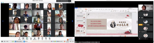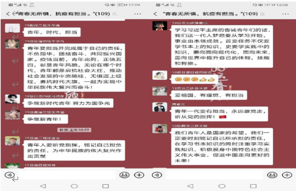 “五四青年说”线上宣讲,歌颂战“疫”中青年无私奉献的精神与担当、厚植青年在疫情防控的战疫中贡献的青春力量。在主题宣讲过程中,团委书记韩晓欧老师以《“战疫一代”与中国未来》、《学习寄语精神,做知行合一的新时代青年》为中心,讲实例、传真意、学寄语、做表率;四名优秀青年学生代表2018级英语2班张嘉欣、丁佳慧、翻译2班任君洁、日语2班赵雅宁同学以青春无所惧,抗“疫”有担当为切入点,勉励青年学子应志存高远,心怀祖国,把个人的“小我”融入祖国的“大我”,积极奉献自己的青春力量。