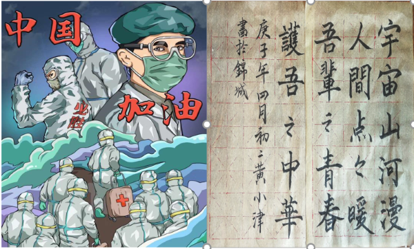 在网络征集战“疫”青春作品中,内容涵盖绘画、书法、征文、海报设计、歌曲展示、视频制作等版块,共计收集作品60余份,用画作展风采,用墨笔抒情怀,用歌声传希望,用坚守换未来,充分展示了青年学子同气连枝、共盼春来的众志成城。