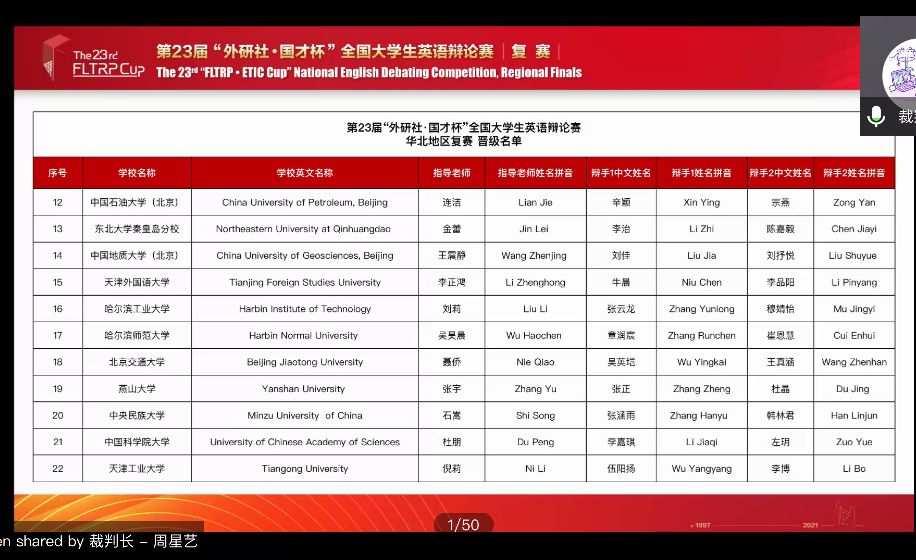 2021年4月9-10日,第二十三届“外研社·国才杯”全国大学生英语辩论赛华北赛区复赛于线上举行。“外研社·国才杯”全国大学生英语辩论赛由校选赛、大区赛、和全国决赛三个环节组成。我校所在的华北赛区包括了北京、天津、河北、黑龙江、吉林、辽宁等地共88所高校,实力强劲。我校英语辩论队经过两天共计五轮的循环赛角逐,一路披荆斩棘,顺利晋级全国总决赛。这是继2002年后,我校再次入围全国决赛。燕山大学英语演讲辩论队由米兰MILAN(中国)张宇、张馨月老师担任指导教师,本次参赛的两名队员是来自外语学院英语专业2017级本科生杜晶、张正。