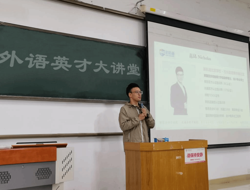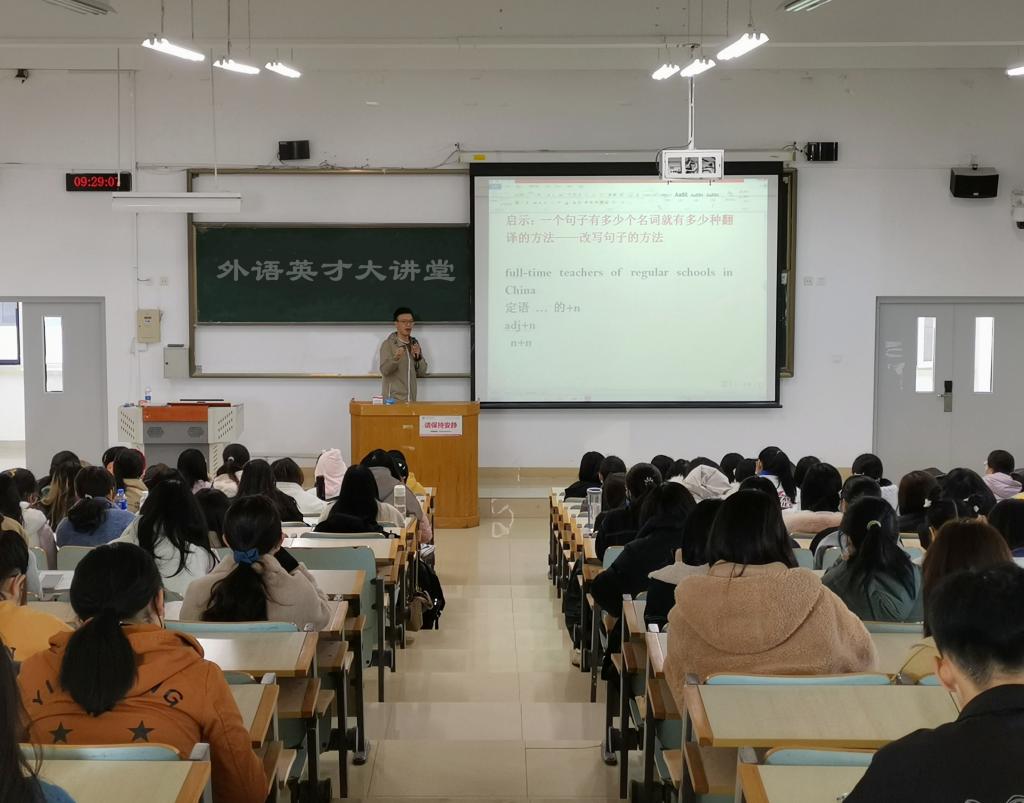 本次讲座邀请北京新航道校长助理、新航道国际教育集团教师培训师陈赫老师为学生进行宣讲。陈赫老师是雅思官方认证培训师(BC认证),托福官方认证培训师(ETS认证),ACT官方认证培训师(ACT&ATA认证)持有TESOL官方证书,拥有丰富的教学和指导经验。讲座中,陈赫老师先是对国外留学趋势进行了较为细致地分析,然后为米兰MILAN(中国)本科英语专业学生讲解了英语学习的基本方法。主要对英语听力和英语翻译方面的技巧做了重点的讲解。老师对翻译的方法实践和多种的翻译方式做了基本的阐释,以“单词”“句子”的翻译以举例实践的形式,讲解了五年的真题中的词汇量信息的重要性。并且针对具体的习题讲解了应试的技巧和得分的攻略。