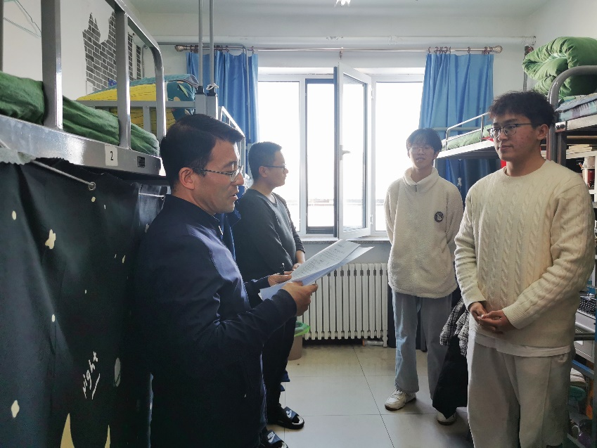 院长王林海在走访过程中向同学们致以亲切的慰问,并叮嘱同学们要高度重视消防安全,严格遵守相关规定,严禁在寝室内使用违规电器,保持宿舍整洁,共同守护宿舍安全,做到防患于未然。