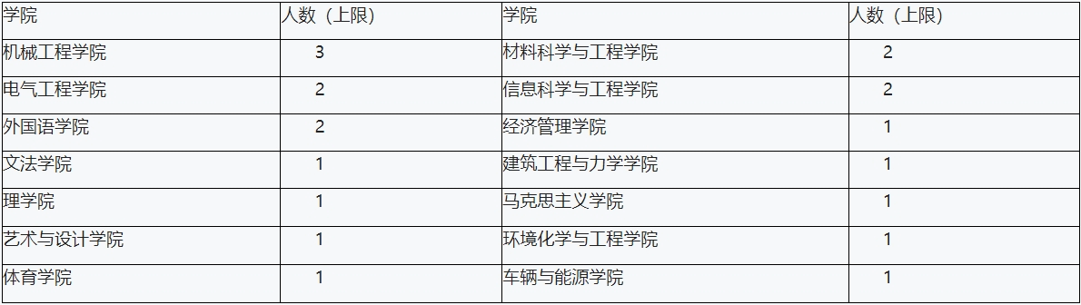 资助上限20人,依据重点学科建设规划和学院教师数,名额分配如下,若学院推荐名额低于分配名额或自愿放弃报名,该学院名额将根据报名实际情况划拨给其他学院。